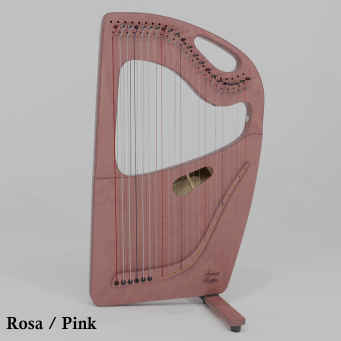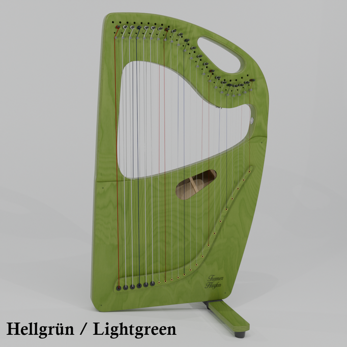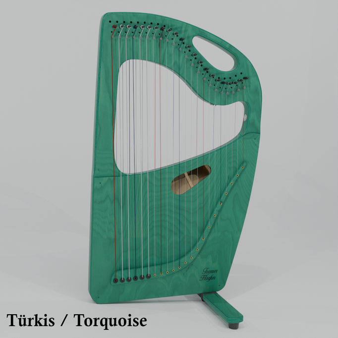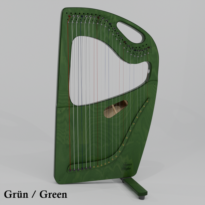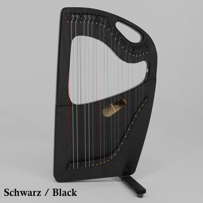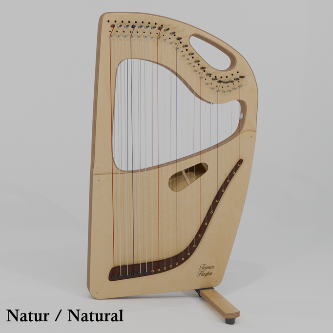 Die Harfe kann gut auf dem Schoß stehend gespielt werden und hat eine mittlere Saitenspannung.